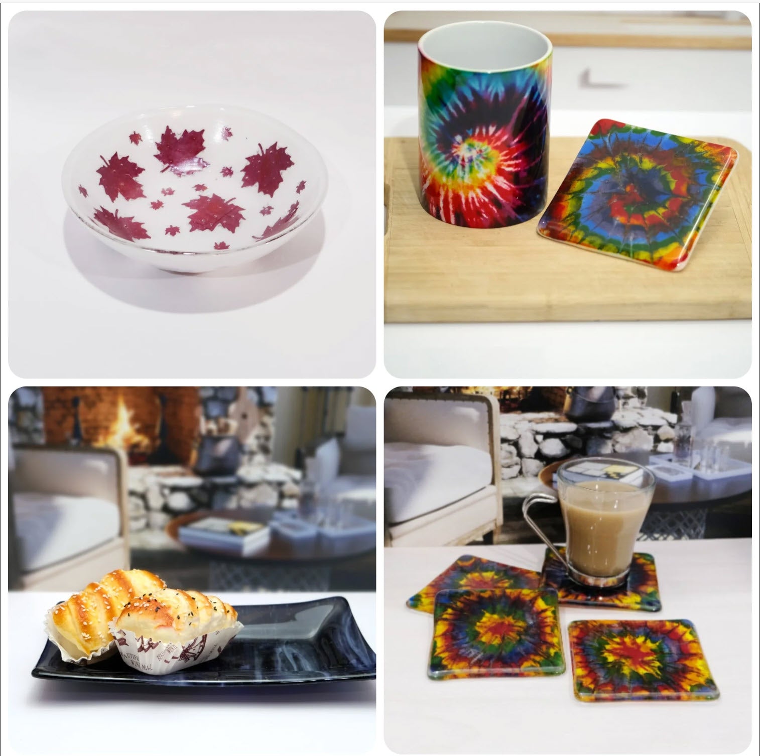 bowls, coasters, slumped bottles, and jewelry that allows customers to find