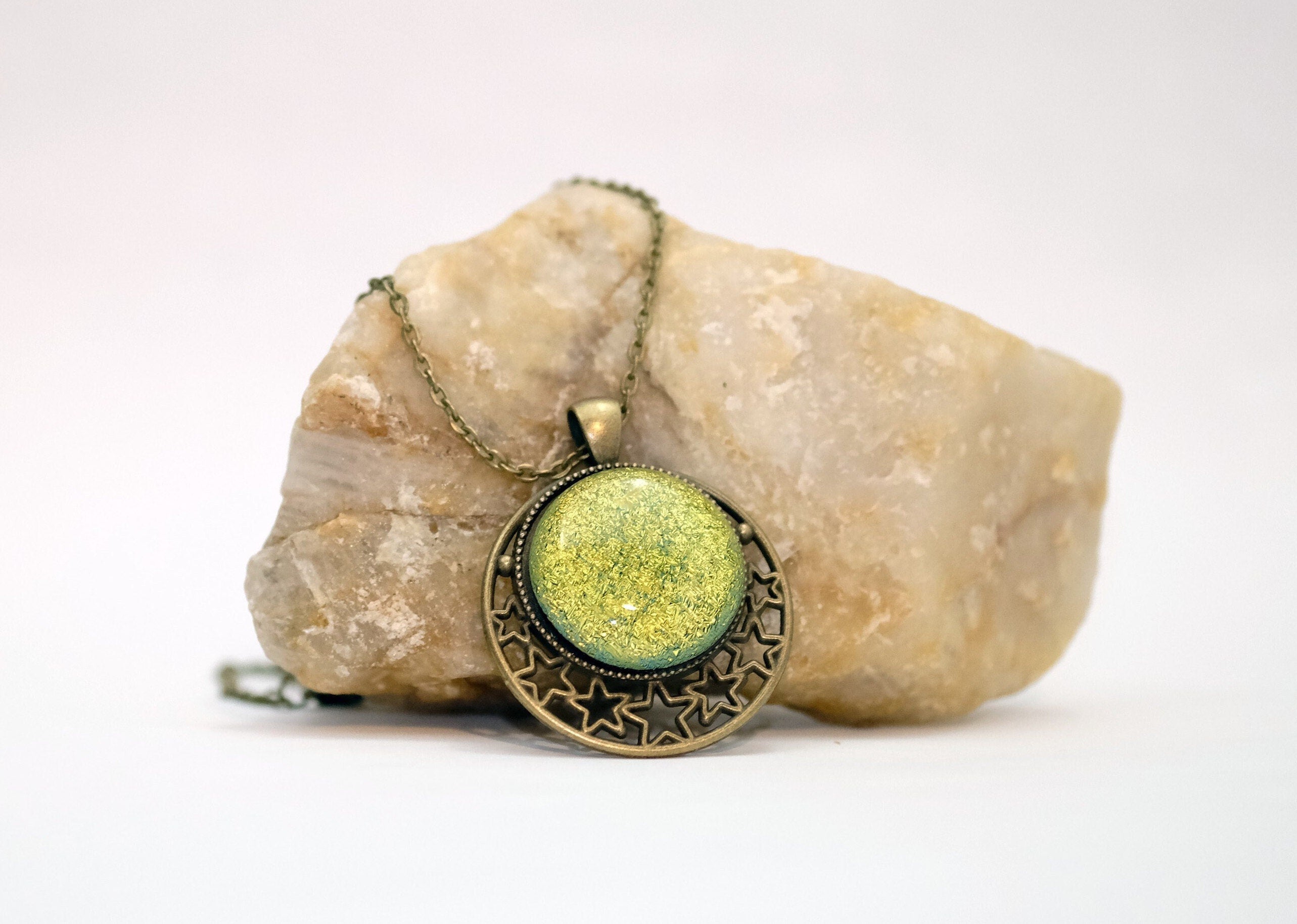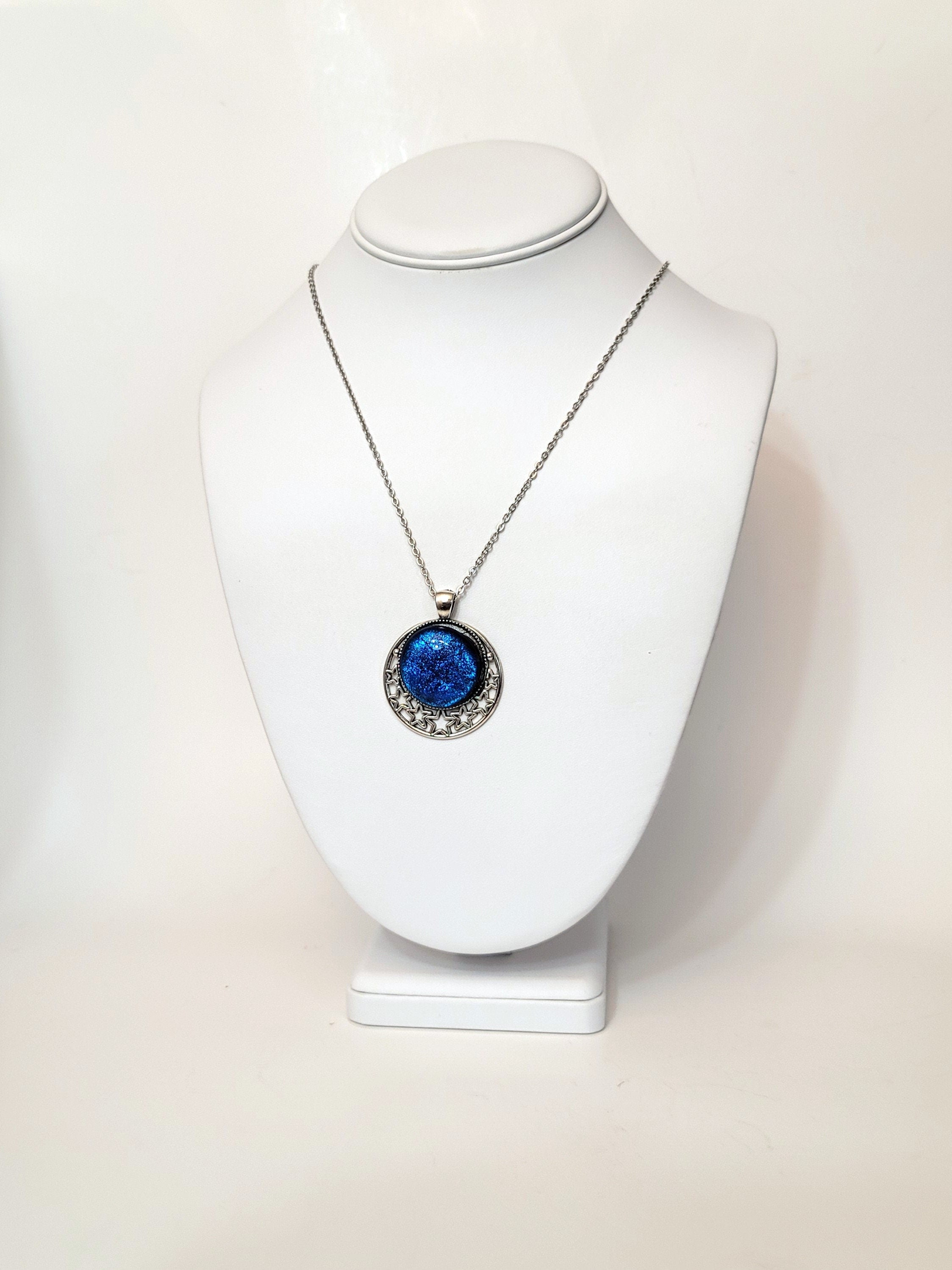 Mesmerizing dichroic glass paired with moon and stars pendants.