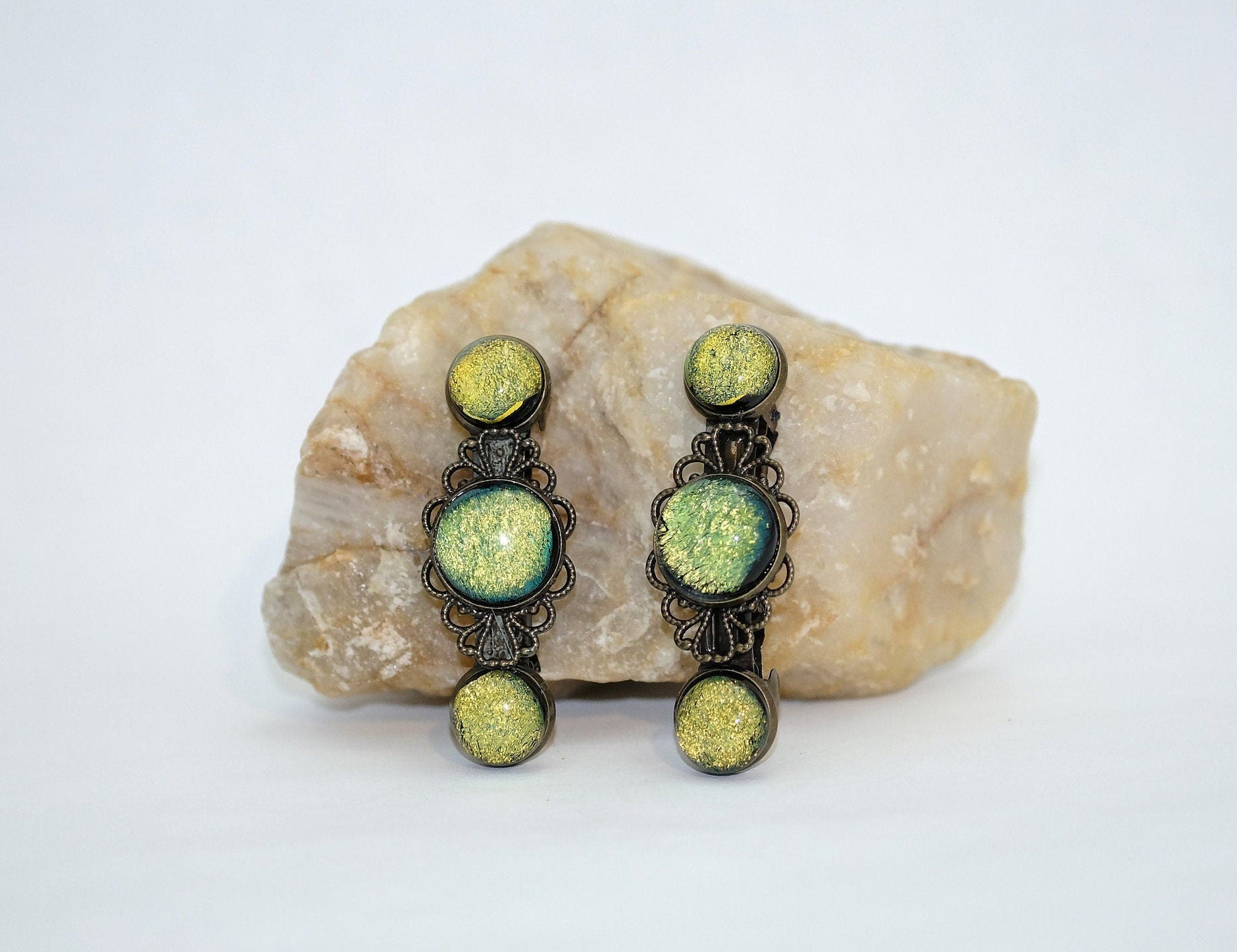 Barrette pair, bronze flowers with yellow/green dichroic fused glass cabochons, french clip, 2 1/4 inches