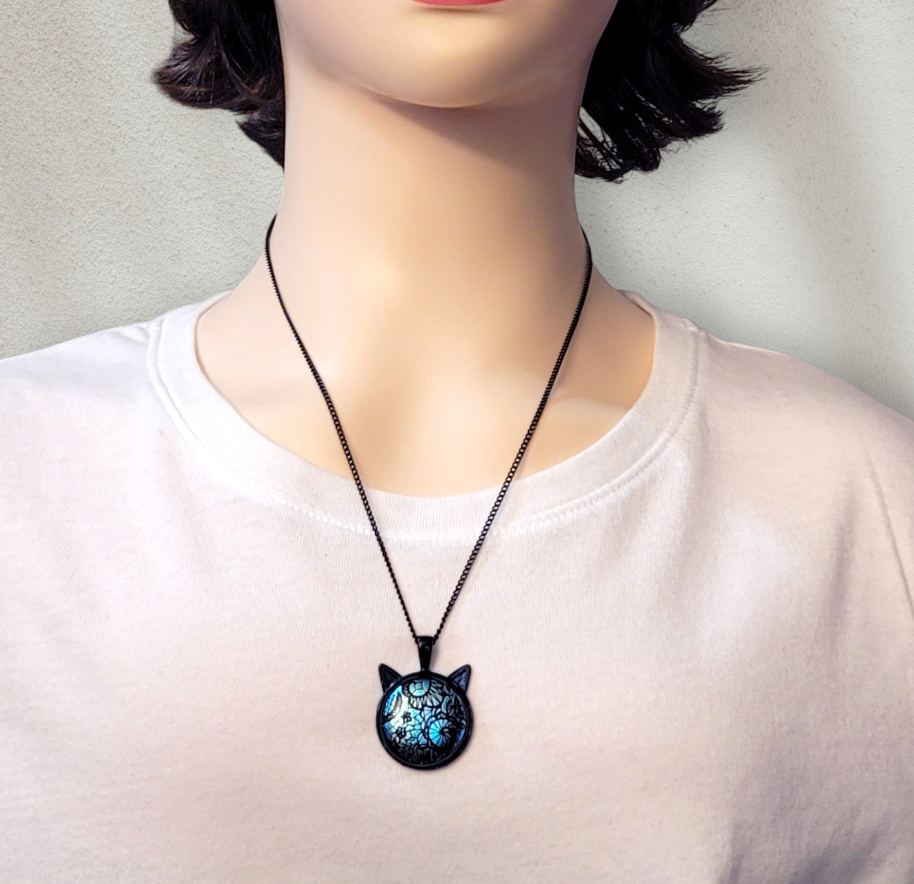Magical Black Cat Pendant Necklace with Blue and Black satin finish lace look Dichroic Glass Center Stone on 20 in black chain
